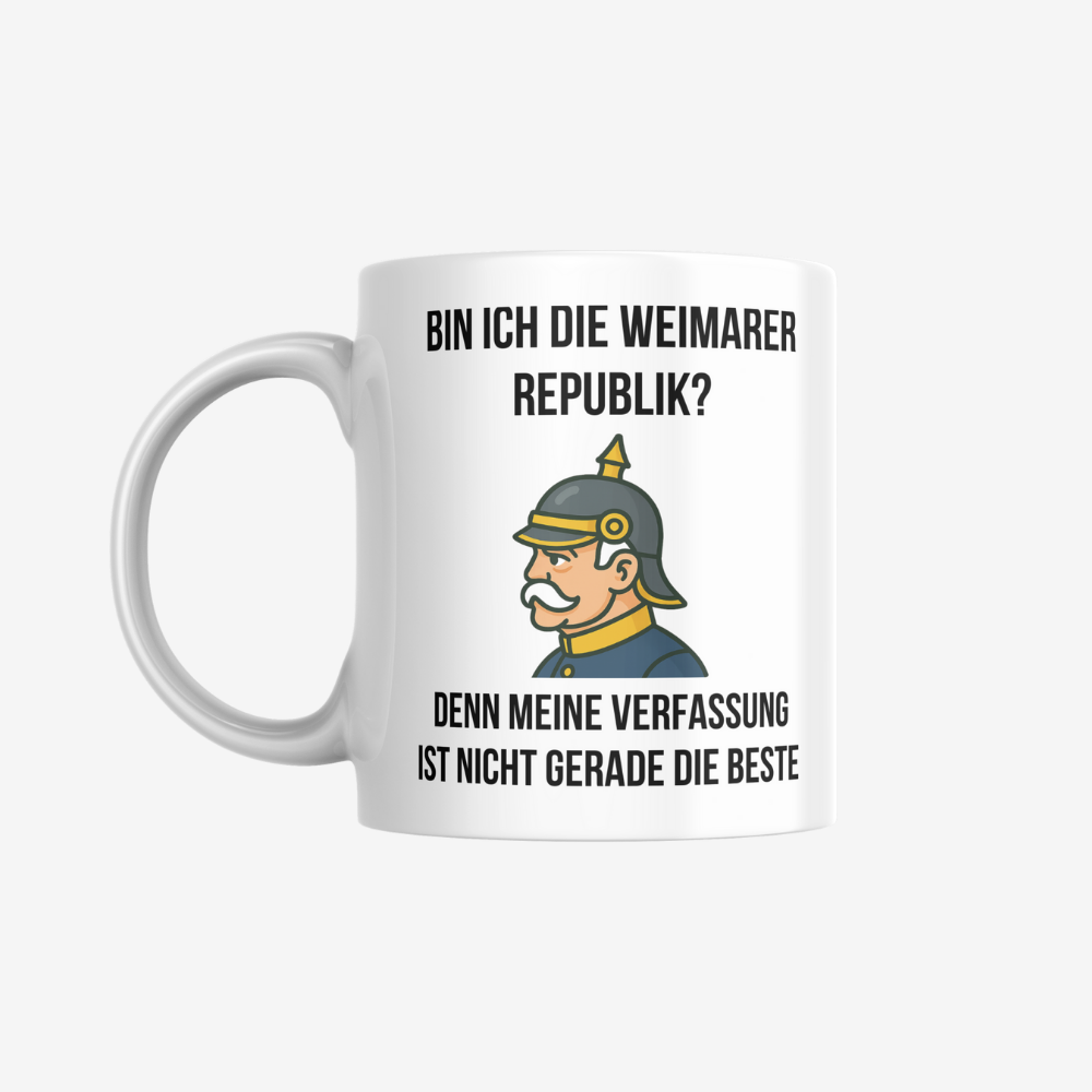 Geschichtsreferenz trifft Nervenzusammenbruch. Diese Tasse ist für alle, deren Verfassung wackelt – innerlich wie institutionell. Instabil, überfordert und kurz vor dem Notstand.